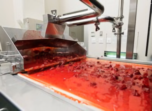 ジャムやフルーツスプレッドは、原料ごとに果肉の様子や状態が異なります。当装置は、ニコンの持つ「分光技術」を用い、ベルトコンベアを流れるジャム状の原料を連続的に撮影した画像から異物や夾雑物を検出し、バキューム装置で吸い出すことで自動的に除去します。