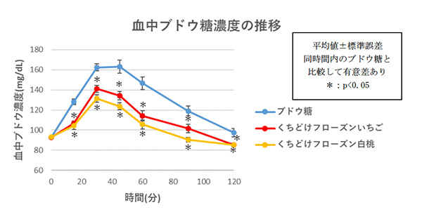 ブドウ糖と比較して15分から120分の間でくちどけフローズン いちごと白桃の血中ブドウ糖濃度は有意に低い。
