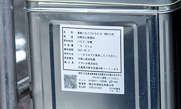 ジャム用のフルーツ原料のラベルには、原産国・加工場・品種・加工日などの原料情報が入った二次元コードが印刷されています。配合時に使った原料すべての二次元コードを読み取ることによって、どの時点でどの原料を使用したかが記録されます。また、ジャム一瓶ごとに印刷された個別の番号によって製品と原料との関連付けをおこない、速やかに追跡できる体制を整えています。