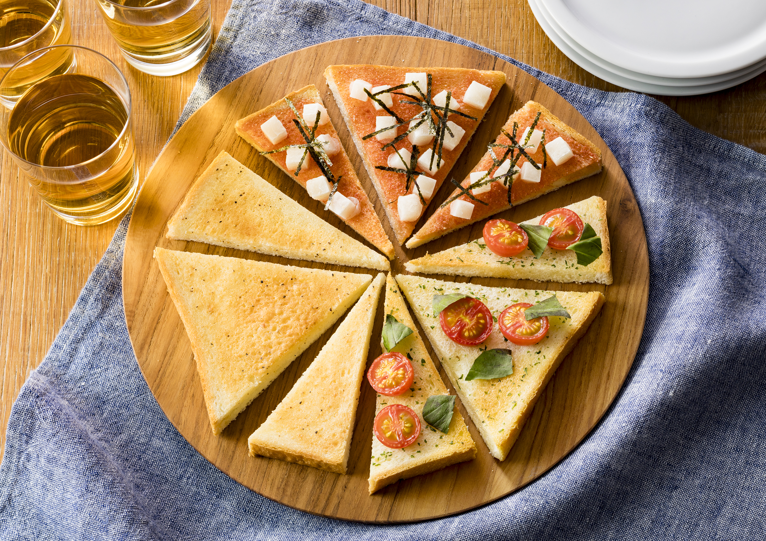 食パンを三角形に切って、さまざまな味のトーストスプレッドとお好みの具材でつくるピザ風トーストです。